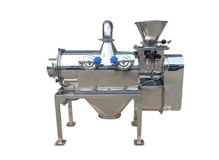 本設(shè)備篩網(wǎng)為圓筒狀,置于機(jī)體內(nèi),物料通過(guò)螺旋輸送系統(tǒng)后與氣流混合、霧化進(jìn)入網(wǎng)筒內(nèi),通過(guò)網(wǎng)筒內(nèi)風(fēng)輪葉片使物料同時(shí)受到離心力和旋風(fēng)推進(jìn)力,從而使物料噴射過(guò)網(wǎng),過(guò)網(wǎng)的物料從細(xì)料排出口排出,不能過(guò)網(wǎng)的物料沿筒壁從粗料排出口排出,達(dá)到快速分離的目的。