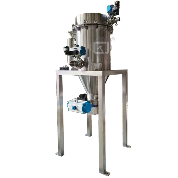 c) -料倉(cāng)充滿物料時(shí),真空泵自動(dòng)關(guān)閉,輸送設(shè)備內(nèi)的壓力達(dá)到平衡。放料閥開(kāi)啟,物料通過(guò)出料口流出,并直接落入儲(chǔ)料容器。